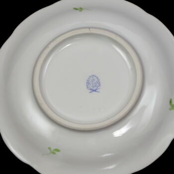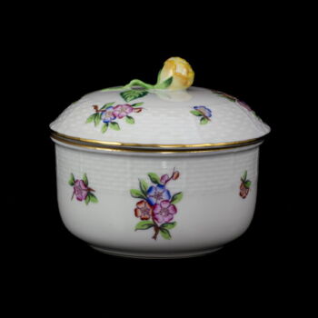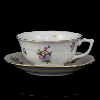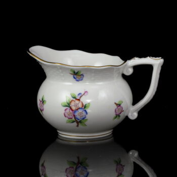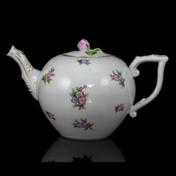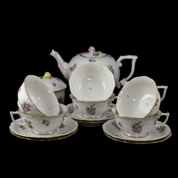 | ETON pattern painted, glazed Herend porcelain tea set (6 people). Contains: 1 teapot with lid, 1 sugar bowl with lid, 1 creamer, and 6 teacups and saucers. In impeccable, beautifully preserved condition. Marked: mid-second half of the 20th century with Herend brand mark, 487 mold number scratched into the mass. | |