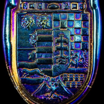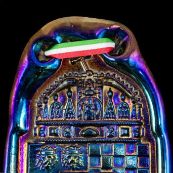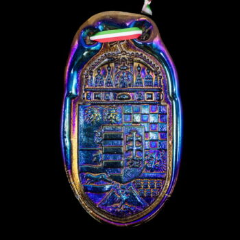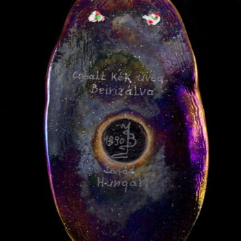 | Cast, self-colored cobalt blue glass depicting the coat of arms of Hungary, decorated with an iridescent metal oxide layer. Dimensions: 21.5 x 12.5 x 1 cm. Marked: on the back "JB 1990 Parád Hungari Cobalt blue glass iridescent" | |