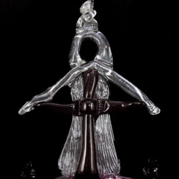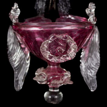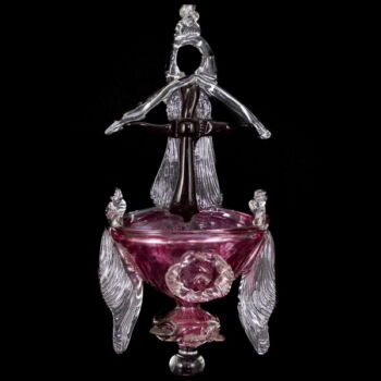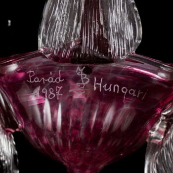 Large, blown glass holy water container made of colorless and self-colored ruby ​​red glass. Dimensions: 32 x 15 x 11 cm. Marked: Parád, 1987 JB. Hungari.