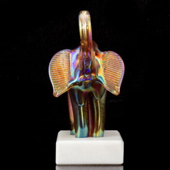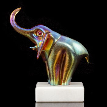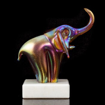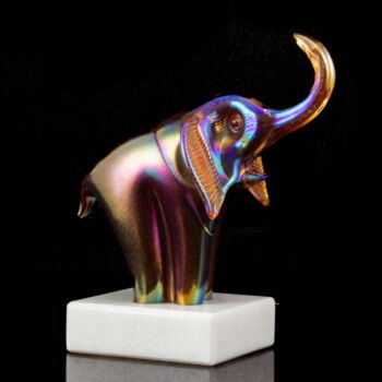 Fehérmárvány talapzaton, üveg elefánt figura: önmagában szinezett, fújt üveg irizáló fémoxid díszítésű felülettel. Méretei: 20 x 18 x 8,5 cm. Jelzett: JB Parád. 1990 körül.