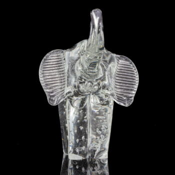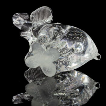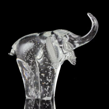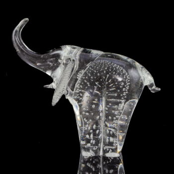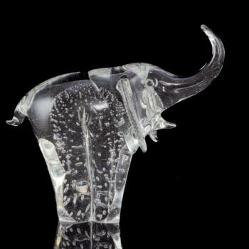 A self-leveling, blown glass elephant figurine. Dimensions: 14 x 15.5 x 9 cm. Marked: JB Parád Hungari written on the base, circa 1990.