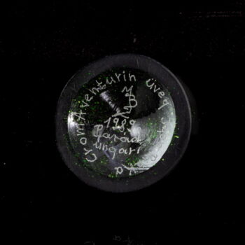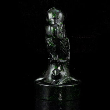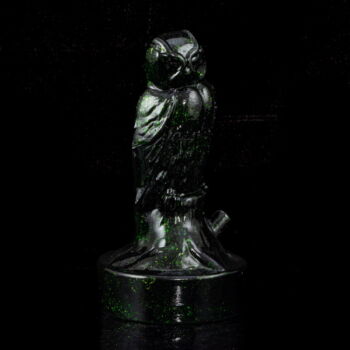 A molded glass owl figurine colored dark green with Chrome Aventurine, dimensions: 12.5 x d:6.5 cm. Marked: JB 1989 Parád Hungari engraved inscription "CromAventurine glass Very rare".