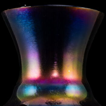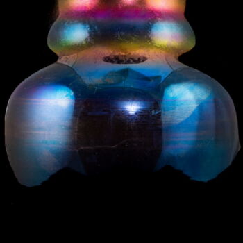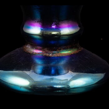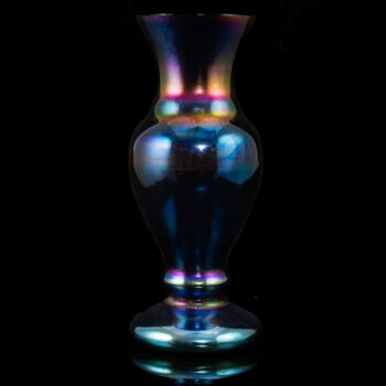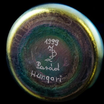 | Önmagában szinezett, kobaltkék fújt üveg, kerek talpról felhúzott öblös testű amfóra-szerű váza lilás-acélkék lüszterezésű felület díszítéssel. Méretei: 25 x d:10,5 cm. Jelzett: JB 1999 Parád Hungari gravírozott készítőjelzéssel. | |
