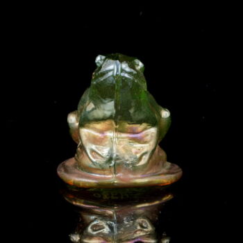 Molded, self-colored glass frog figurine with iridescent surface decoration. Dimensions: 5.5 x 6.5 x 5.5 cm. Marked: JB 1990 Parád Hungari engraved maker's mark.