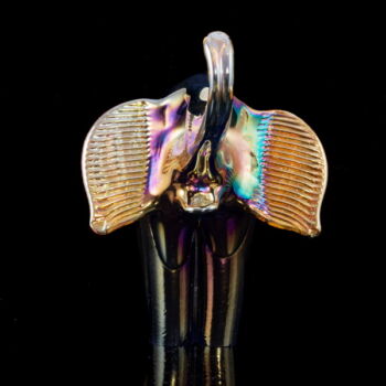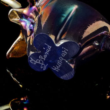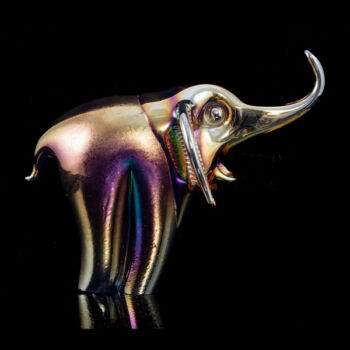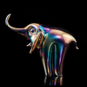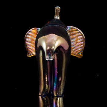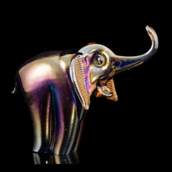 Self-colored, blown glass elephant figurine, iridescent surface with decoration. Dimensions: 14 x 17 x 10.5 cm. Circa 1990. Marked: engraved on the base with the JB Parád Hungari maker's mark.