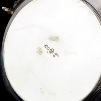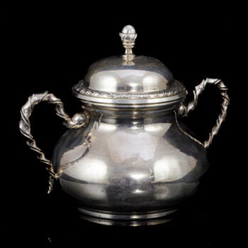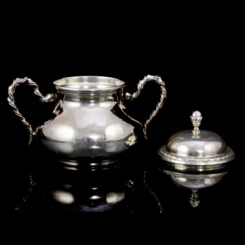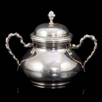 Ezüst cukortartó doboz két csavart díszítésű füllel, levehető fedéllel. Nettó: 200.5 gramm. Jelzett: 1944-1968 között használt olasz (PI, Pisa), 800%. ezrelékes ezüst fémjellel. Mérete: 10.5 x 14 x 9.5 cm.
