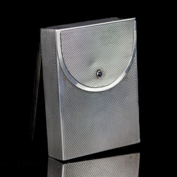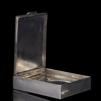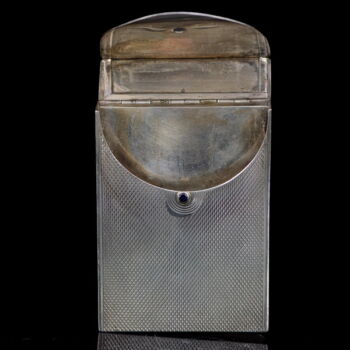 | 800-as finomságú ezüstből készült, zsanérosan záródó, dupla fedelű, téglatest formájú cigaretta szelence. Külső felülete gilosált díszítéssel. Egyik fedelének zárógombjában 1 kisebb, kerekre csiszolt sötétkék zafír kővel Cca. 0,10 ct. Nettó tömege: 97 gramm; Méretei: 7,5 x 5,5 x 1,5 cm. Jelzett: 1968-tól használt olasz fémjellel, valamint 2016-tól használt magyar fémjellel egyaránt. | |