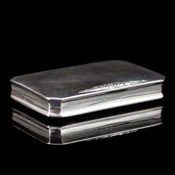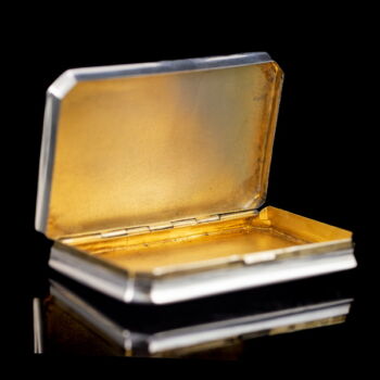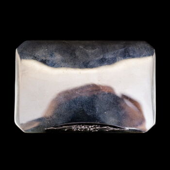 | 800-as finomságú ezüstlemezből készült, lecsapott sarkú, téglalap alakú, zsanérosan záródó szelence, fedlapján virágfűzér díszítéssel. Belül tüziaranyozással. Nettó tömege: 38,5 gramm; méretei: 7,5 x 5 x 1 cm; Feltehetően osztrák vagy magyar, XIX. század vége. XX. század eleje, Jelzett: 800-as finomságjelzéssel, valamint pótlólag beütött, 2016-tól használatban lévő magyar fémjellel. | |