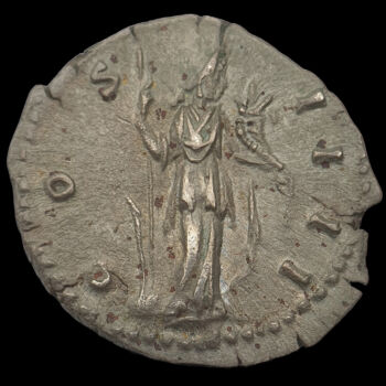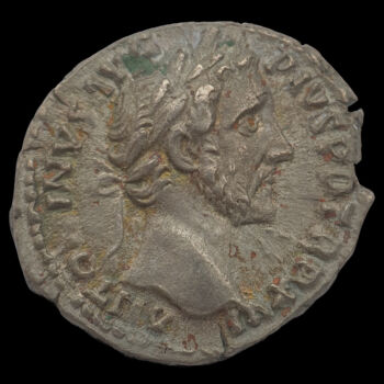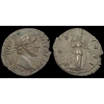 Antoninus Pius ezüst denár. Kr.u. 151-152. Verdehely: Róma. Tömege: 3.02 gramm. Méretei: 17 x 19 mm. RIC 222. Előlap: ANTONINVS AVG PIVS P P TR P XVI (Antoninus Pius babérkoszorús büsztje jobbra) Hátlap: COS IIII (Fortuna istennő jobbra álló alakja kezében bőségszaru és kormánylapát) |