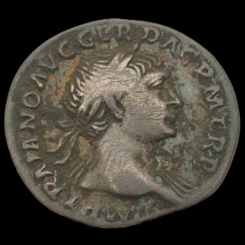 Traianus római császár ezüst denár. Kr.u. 103-111. Verdehely: Róma. Tömege: 3.26 gramm. Mérete: 17 x 19 mm. Előlap: IMP TRAIANO AVG GER DAC P M TR P (Traianus jobbra néző babérkoszorús portréja) Hátlap: COS V P P S P Q R OPTIMO PRINC (Fortuna istennő balra, kezében hajóorrhoz rögzített kormánylapát és bőségszaru). |