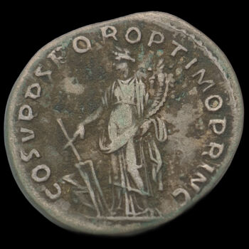 Traianus római császár ezüst denár. Kr.u. 103-111. Verdehely: Róma. Tömege: 3.26 gramm. Mérete: 17 x 19 mm. Előlap: IMP TRAIANO AVG GER DAC P M TR P (Traianus jobbra néző babérkoszorús portréja) Hátlap: COS V P P S P Q R OPTIMO PRINC (Fortuna istennő balra, kezében hajóorrhoz rögzített kormánylapát és bőségszaru). |