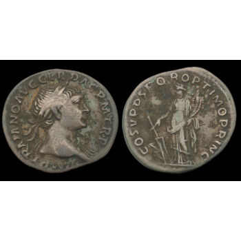 Traianus római császár ezüst denár. Kr.u. 103-111. Verdehely: Róma. Tömege: 3.26 gramm. Mérete: 17 x 19 mm. Előlap: IMP TRAIANO AVG GER DAC P M TR P (Traianus jobbra néző babérkoszorús portréja) Hátlap: COS V P P S P Q R OPTIMO PRINC (Fortuna istennő balra, kezében hajóorrhoz rögzített kormánylapát és bőségszaru). |