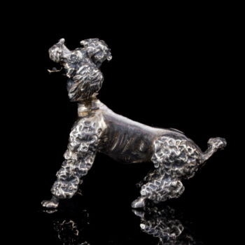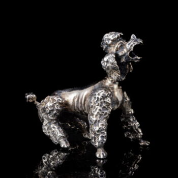 Mini silver poodle dog figurine made of 800 fine silver. Net weight: 81.1 grams; Dimensions: 5 x 4 x 6.5 cm. Marked: 800 fineness mark.
