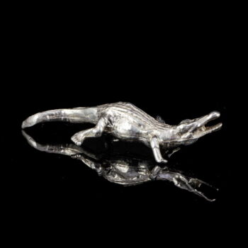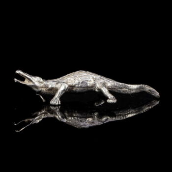 | 800-as finomságú ezüstből készült mini krokodil figura. Nettó tömege: 29,1 gramm; Méretei: 1,5 x 7 x 3 cm. Jelzett: 1944-68-között használt olasz fémjellel, valamint 2016-tól használt magyar fémjellel egyaránt. | |