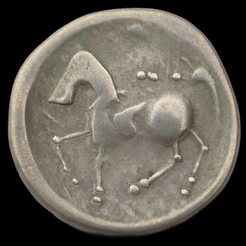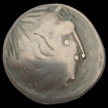 Kelta ezüst tetradrachma. Veleméri-típus. Tömege: 8.51 gramm. Átmérője: 23 mm.