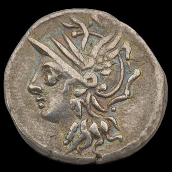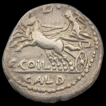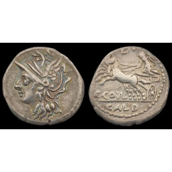 C. Coelius Caldus római konzul, ezüst denár. Római Köztársaság. Kr.e. 104. Tömege: 3.88 gramm. Mérete: 17 x 18 mm. Előlap: Roma balra. Hátlap: Viktória istennő kétlovas kocsiban (biga) balra. C.COIL CALD |
