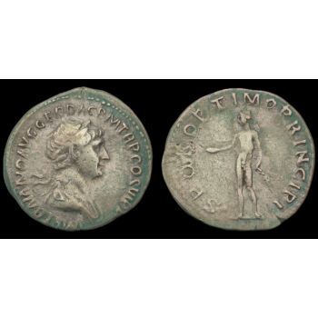Traianus római császár (Kr.u. 98-117) ezüst denár. RIC 276. Kr.u. 112-114. Verdehely: Róma. Tömege: 3.28 gramm. Mérete: 20 x 19 mm. Előlap: IMP TRAIANO AVG GER DAC P M TR P COS VI P P (Traianus jobbra néző babérkoszorús portréja) Hátlap: S P Q R OPTIMO PRINCIPI (Genius balra, kezében patera és kukorica). |