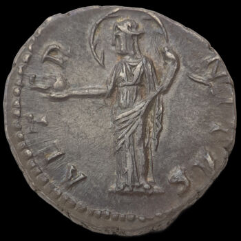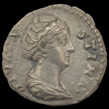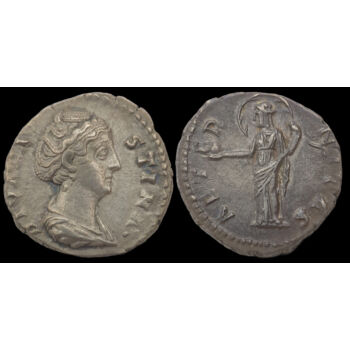 Faustina római császárné ezüst denár. RIC 351a. Kr.u. 141. Verdehely: Róma. Tömege: 3.3 gramm. Mérete: 17 x 17 mm. Előlap: DIVA FAVSTINA (Faustina jobbra néző diadémes portréja) Hátlap: AETERNITAS (Providentia balra áll, feje körül fátyol, jobb kezében földgömb). |