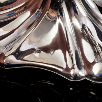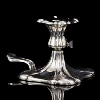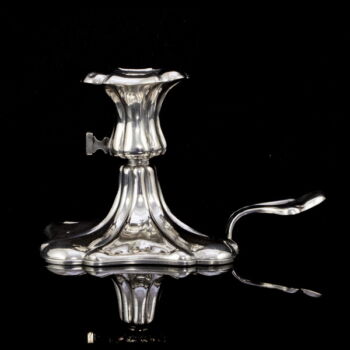 Kézzel trébelt 800-as finomságú ezüst kézi gyertyatartó, Nettó tömege:180 gramm; méretei: 10 x 15,5 x 10,5 cm. Jelzett: 1867-1922 között használt bécsi fémjellel.