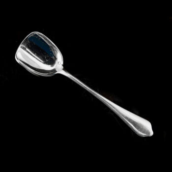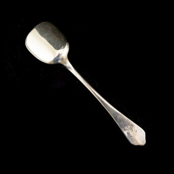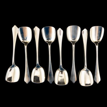 | 800-as finomságú ezüstből készült fagylaltos kanál "szamárhát" fazonú nyéllel. Mindösszesen 8 darab, Nettó össz.tömege: 211,3 gramm. Jelzett: 1867-1937 között használt pesti fémjellel. Gravírozott monogrammal a nyelében. | |
