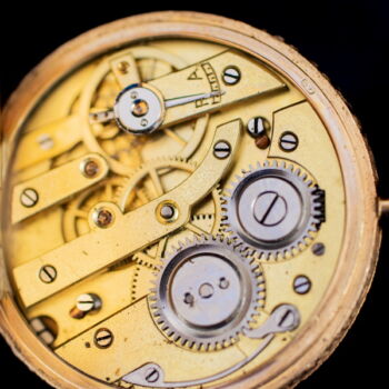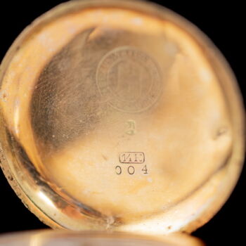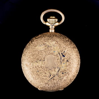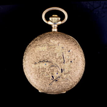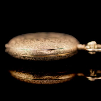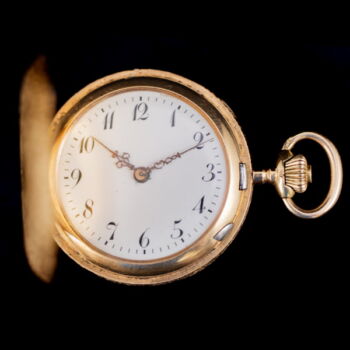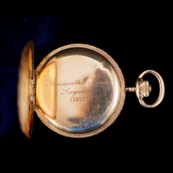 | 14 karátos finomságú, gazdagon vésett, duplafedeles arany tokban, arany porfogófedéllel, zománcfestés nyomaival. Svájci mechanikus óraszerkezettel. Arab számos, percbeosztásos zománcozott számlappal. Jelzett tok: Brauswetter János. Bruttó tömege: 24,05 gramm. Működik. Eredeti dobozában. Svájc,1900-körül. | |