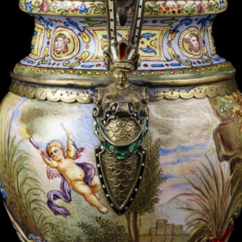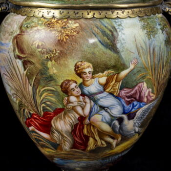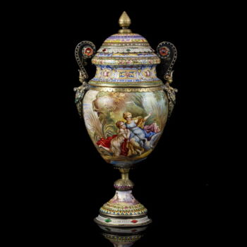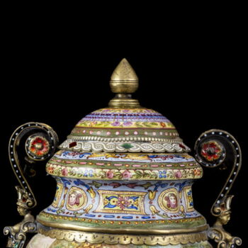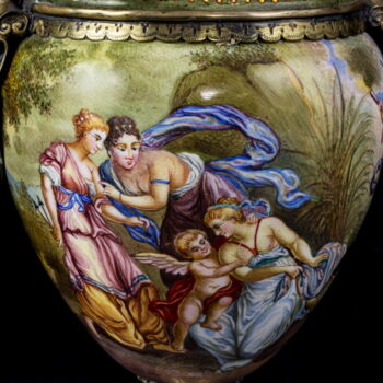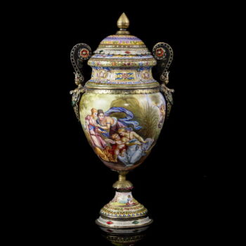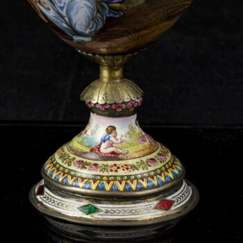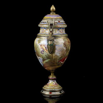 | Aranyozott ezüst fedeles urnaváza kariatidás fülekkel, kerek talpon gömbölyded palástú urnaváza test, teljes felületén kézzel festett zománc archaikus jelenetekkel. Talpán, fedelén és fülein rekeszzománcozás és lüszterzománcozás egyaránt megtalálható. Palást belső felületén is zománcfestett díszítésű. Fedelén restaurálás nyomaival. Nettó tömege: 303,9 gramm; Méretei: 18 x d:9 cm.Jelzett: elmosódott osztrák fémjellel, valamint feloldatlan mesterjellel és bécsi hivataljellel. | |