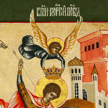 Hand-painted icon on wooden panel: Saint George the Dragon Slayer scene. With Cyrillic inscription at the top of the scene. Oil, wooden panel, 29 x 24 cm. Early 19th century, Russia. Unmarked.