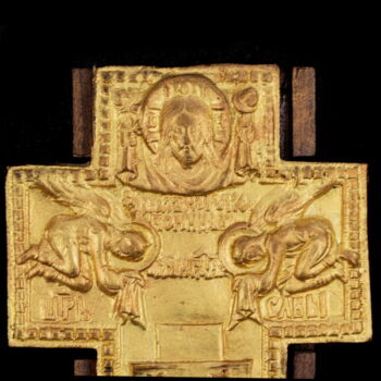 Cast, gilded bronze/copper alloy wall cross mounted on a wooden cross. Dimensions: 38 x 19.5 cm. Mid-second half of 20th century.