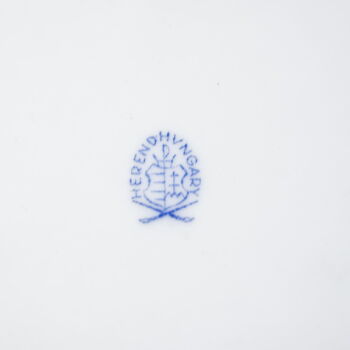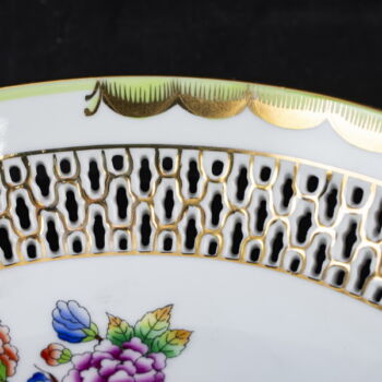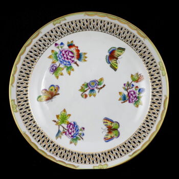 Viktória dekorral festett, mázas, áttört peremű Herendi porcelán kínálótál/dísztál. Méretei: 5 x d:24,5 cm. Jelzett: XX. század II. fele Herendi márkajelzéssel, 7501 formaszámmal.