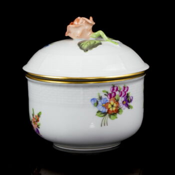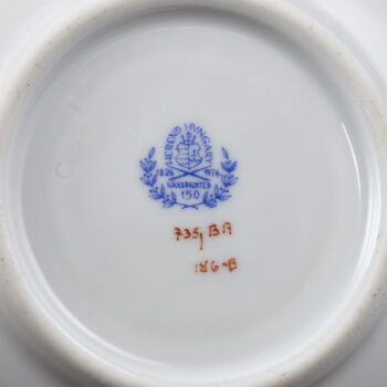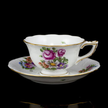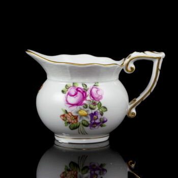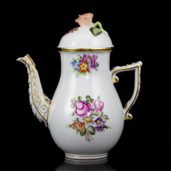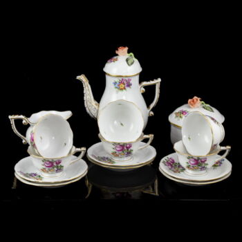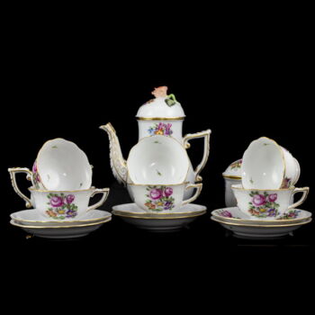 | Virágmintával festett, mázas Herendi porcelán kávéskészlet (6 személyes). Tartalmaz: Kávéskanna fedelével, cukortartó fedelével, tejszínkiöntő, valamint 6 kávéscsésze és alj. Jelzett: 1976-os (150 éves jubileumi) kiadás. Kiöntő és cukortartó fedelének rózsája apró csorbulással. | |