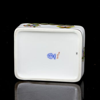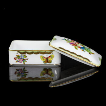 VBO Viktória dekorral festett, mázas Herendi porcelán doboz. Méretei: 4,5 x 10 x 8 cm. Jelzett: XX. század II. fele Herendi márkajelzéssel, 7973/VBO formaszámmal.