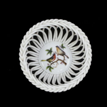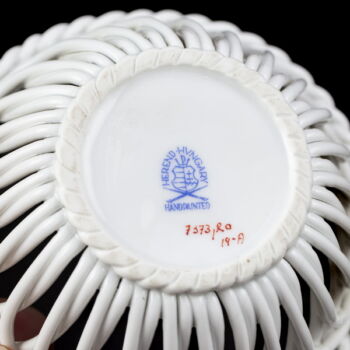 Rothschild dekorral festett, mázas Herendi porcelán kosárka kínáló, méretei: 4 x d:9 cm. Jelzett: XX. század II. fele Herendi márkajelzéssel, 7373 formaszámmal.