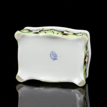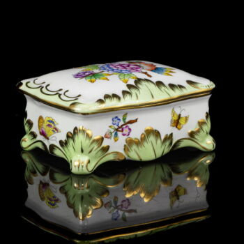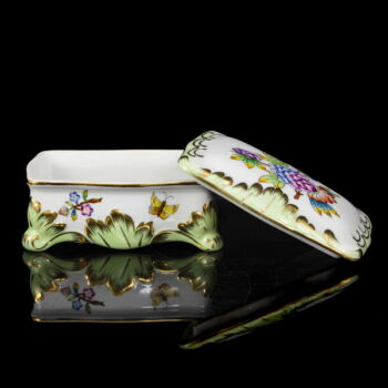 | Gazdagon aranyozott, Viktória mintával festett, mázas porcelán doboz 4 akantuszlevél formájú lábon, levehető fedéllel. Méretei: 4,5 x 10,5 x 8 cm. Jelzett: XX. sz-zad II. fele Herendi márkajelzéssel, 7974/VBO formaszámmal. | |