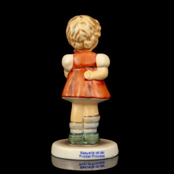 Festett, részben mázas porcelán-kerámia, méretei: 9,5 x d:4,5 cm. Jelzett: Goebel Germany 2001/2002 használt márkajelzéssel, TMK-8 formaszámmal. "Pupet Princess".