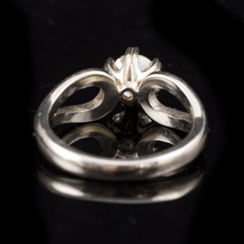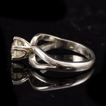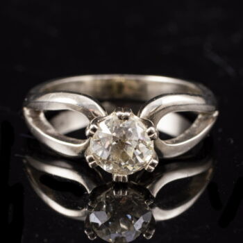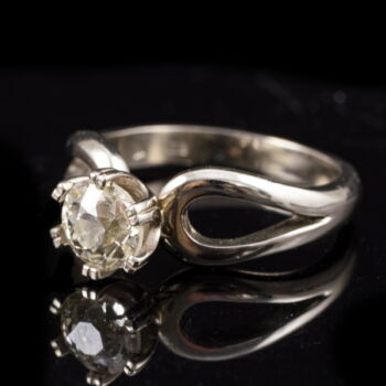 | 14 K white gold, weight: 4.56 grams. 1 larger, old brilliant-cut diamond in a modern six-prong setting, approx. 0.90 ct. (old-cut 2;Cr/TC;Vs2) (The edges of the girdle are heavily worn, with small chips). Marked: Hungarian hallmark used since 2016. Ring size: 54. | |