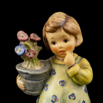 Részben mázas, festett Goebel porcelán kislány figura kezében cserepesvirággal. Méretei: 14 x 6,5 x 6 cm. Jelzett: 1992-93 Goebel márkajelzéssel, 463/0 formaszámmal.