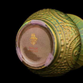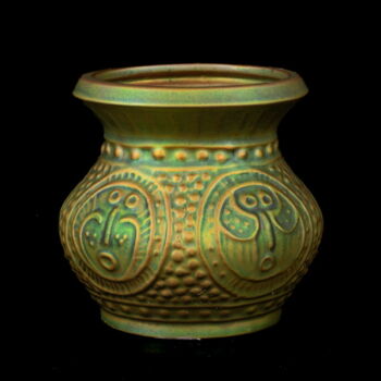 Zöld eozin mázas porcelán kisváza, dombornyomott busómaszkos mintázattal. Méretei: 8 x d:8,5 cm. Jelzett: 1930 körüli hárompajzsos Zsolnay márkajelzéssel.