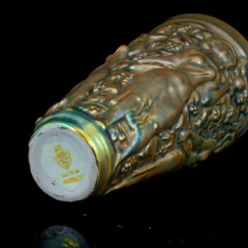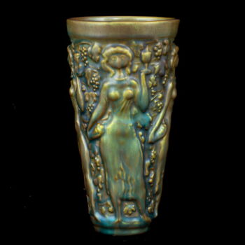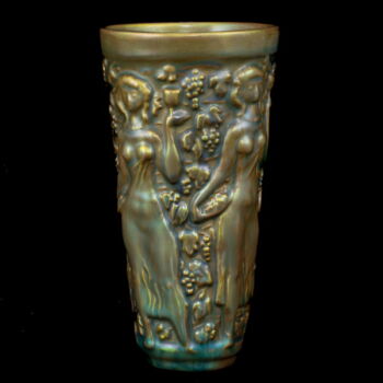 Zöld eozin mázas porcelán pohár, dombornyomott szüretelő nőalakokkal a palástján. Méretei: 16 x d:8,5 cm. Jelzett: 1930 körüli Zsolnay márkajelzéssel.