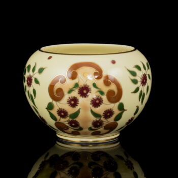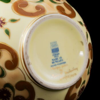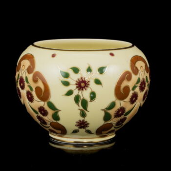 | Miss Szalontay készítő névjegyével ellátott, kerek formájú, vajszínű mázas, virág dekorral festett virágkaspó. Méretei: 8 x d:11,5 cm. Jelzett: XX. század második fele Zsolnay márkajelzéssel valamint kézzel írott készítőjelzéssel: "Unique piece by Miss M. Szalontay 644/VII./0033" | |