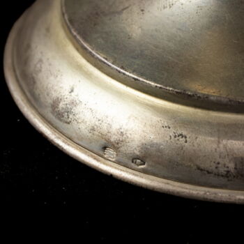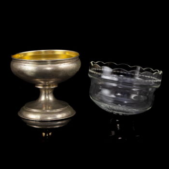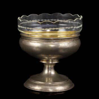 | 800-as finomságú ezüst, nettó tömege: 117,7 gramm, méretei: 11,5 x d:10,5 cm. Kerek talpon, gömbölyded forma kínálórésszel, amely belül tüziaranyozott. Homokfúvott csillagmintázatú pótolt üvegbetéttel. Jelzett: Bécs, 1855-fémjellel. | |