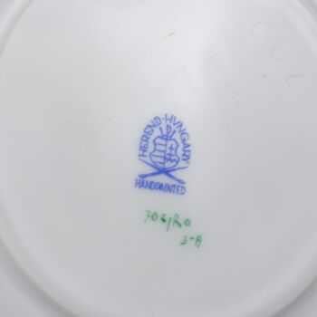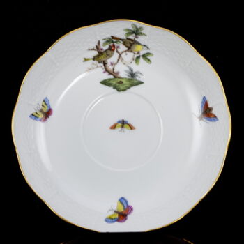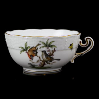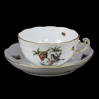 Rotschild (RO) dekorral festett, mázas Herendi porcelán teáscsésze és alj. Méretei:d:16,5 cm. Jelzett: XX. század második fele Herendi márkajelzéssel és 702/RO illetve 733-as formaszámmal.