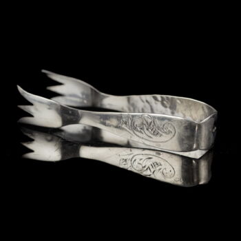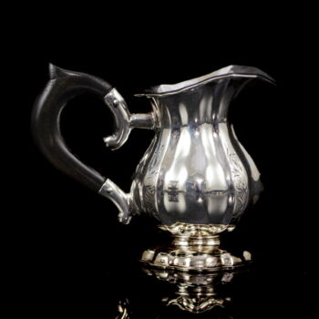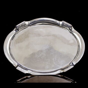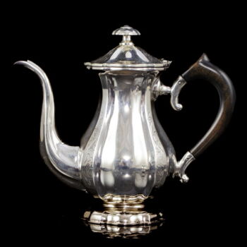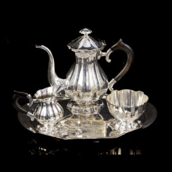 | 925-ös finomságú ezüst kávéskészlet, Bruttó tömege: 769 gramm. A készlet része: 1 ezüst kis tálca, 1 ezüst kávéskanna feketére polírozott fa füllel, zsanérosan záródó fedéllel, 1 tejszínkiöntő feketére polírozott fa füllel, 1 cukortartó kistálka és 1 pici cukorfogó (midösszesen 5 db). Jelzett: Pest, 1966-99 között használt fémjellel és PV-Pénzverde készítőjegyével. | |