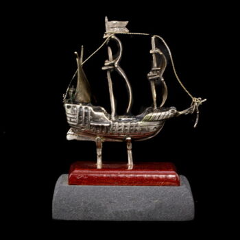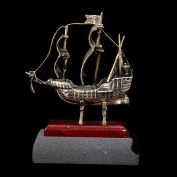 /Kolombusz hajója/:800-as finomságú ezüst, fa talapzaton. Bruttó tömege: 58,3, gramm. Méretei:8,5 x 3 x 6,5 cm. Jelzett: 1968-tól használt olasz (Arezzoi) fémjellel.