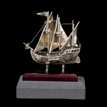 /Kolombusz hajója/:800-as finomságú ezüst, fa talapzaton.Bruttó tömege: 53,2 gramm. Méretei:8,5 x 3 x 6,5 cm. Jelzett: 1968-tól használt olasz (Arezzoi) fémjellel.