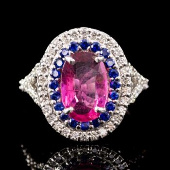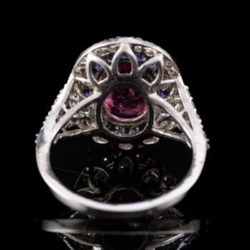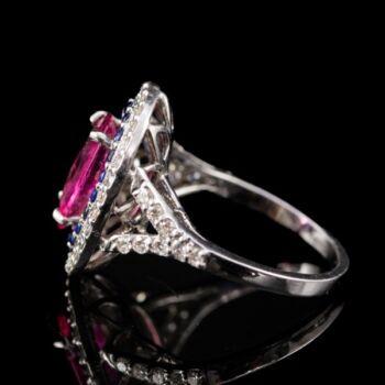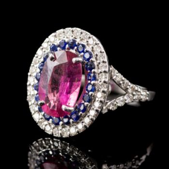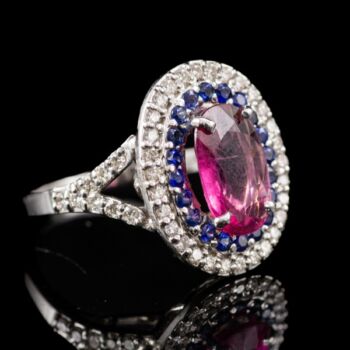 | 18 karátos fehérarany gyűrűsín, Bruttó tömege: 5,86 gramm. Rozetta fazonú gyűrűfej közepében 1 nagyobb, ovál formára fazettált pinkes rózsaszín turmalin Cca. 3 ct. körülötte 20 apró, kék zafír Cca. 0,20 ct; körben 30 apró briliáns csiszolású gyémánt, valamint gyűrűvállakon 8-8 briliáns csiszolású gyémánt, amelyek mindösszesen Cca.0,46 ct. Jelzett: 750-es finomságjelzéssel, valamint francia (Párizs) 1893-tól napjainkig használt import jellel. Gyűrű mérete: 54. | |