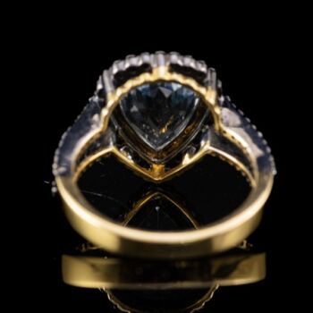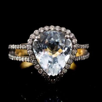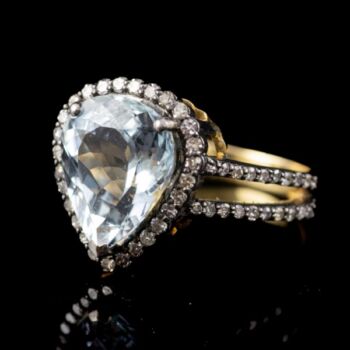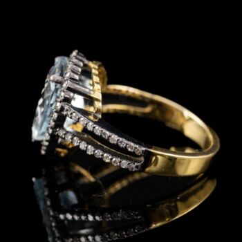 | 14 karátos arany gyűrűsín, Bruttó tömege: 4,75 gramm. Csepp formájú gyűrűfejben és gyűrűvállakon 925-ös finomságú ezüstbe foglalt 68 apró, Achtkant csiszolású gyémánttal Cca.0,34 ct; Közepében háromkarmos foglalatban, cseppformára csiszolt akvamarin Cca.3,25 ct. Gyűrű mérete: 54. | |