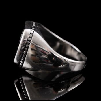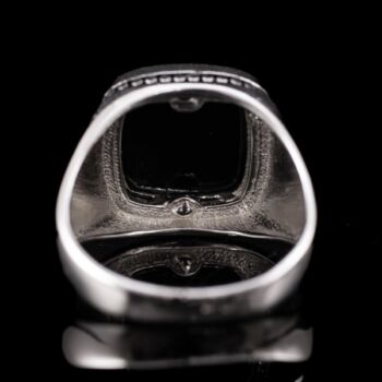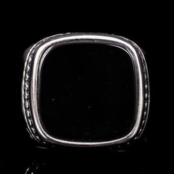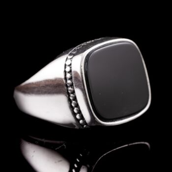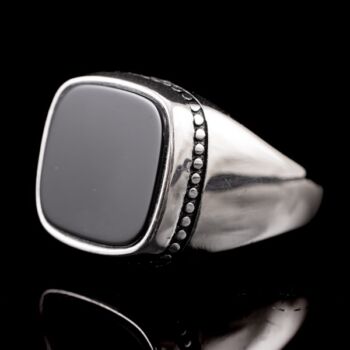 | 925-ös finomságú ezüst pecsétgyűrű, gyűrűfejben 1 nagyobb, négyszögletes forma fekete ónix lappal, gyöngysor szerű díszítéssel. Bruttó tömege: 8,61 gramm. Jelzett: 2016-tól használatban lévő magyar fémjellel. Gyűrű mérete:66. | |