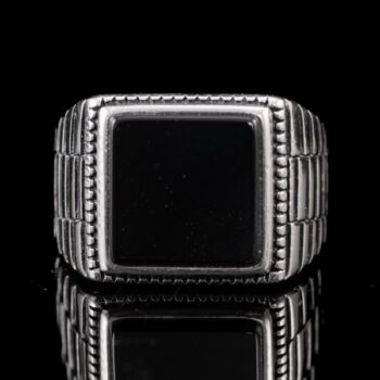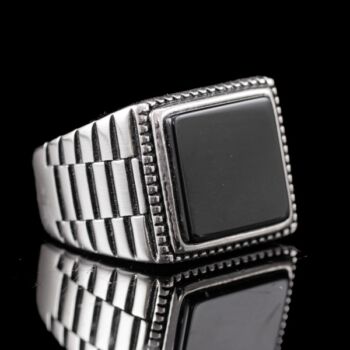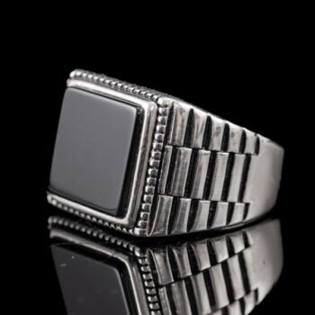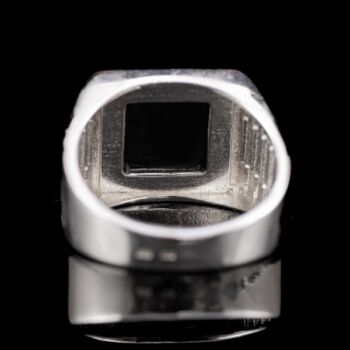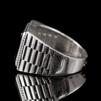 | 925-ös finomságú ezüst pecsétgyűrű, gyűrűfejben 1 nagyobb, négyszögletes forma fekete ónix lappal, "Rolex" stílusú rovátkolt gyűrűvállakkal. Bruttó tömege: 9,06 gramm. Jelzett: 2016-tól használatban lévő magyar fémjellel. Gyűrű mérete:60. | |