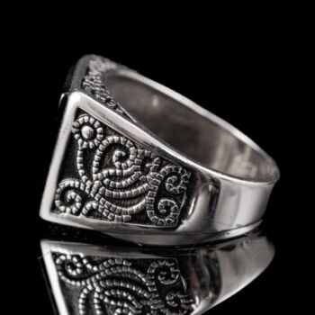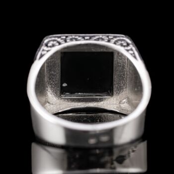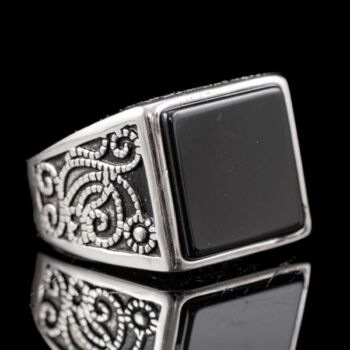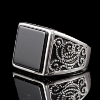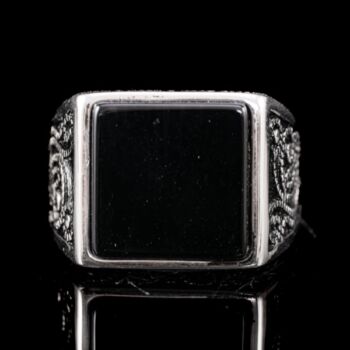 | 925-ös finomságú ezüst pecsétgyűrű, gyűrűfejben 1 nagyobb, négyszögletes forma fekete ónix lappal, stilizált növényi mintázatú, feket zománccal kitöltött gyűrűvállakkal. Bruttó tömege: 10,16 gramm. Jelzett: 2016-tól használatban lévő magyar fémjellel. Gyűrű mérete:66. | |
