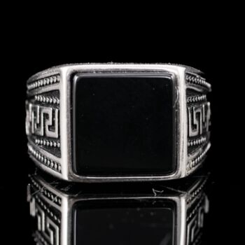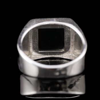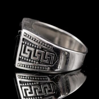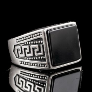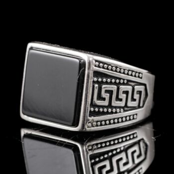 | 925-ös finomságú ezüst pecsétgyűrű, gyűrűfejben 1 nagyobb, négyszögletes forma fekete ónix lappal, vésett görög "futókutya" mintázatú, feket zománccal kitöltött gyűrűvállakkal. Bruttó tömege: 8,23 gramm. Jelzett: 2016-tól használatban lévő magyar fémjellel. Gyűrű mérete:60. | |